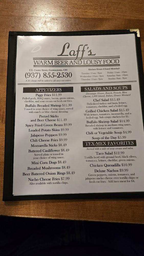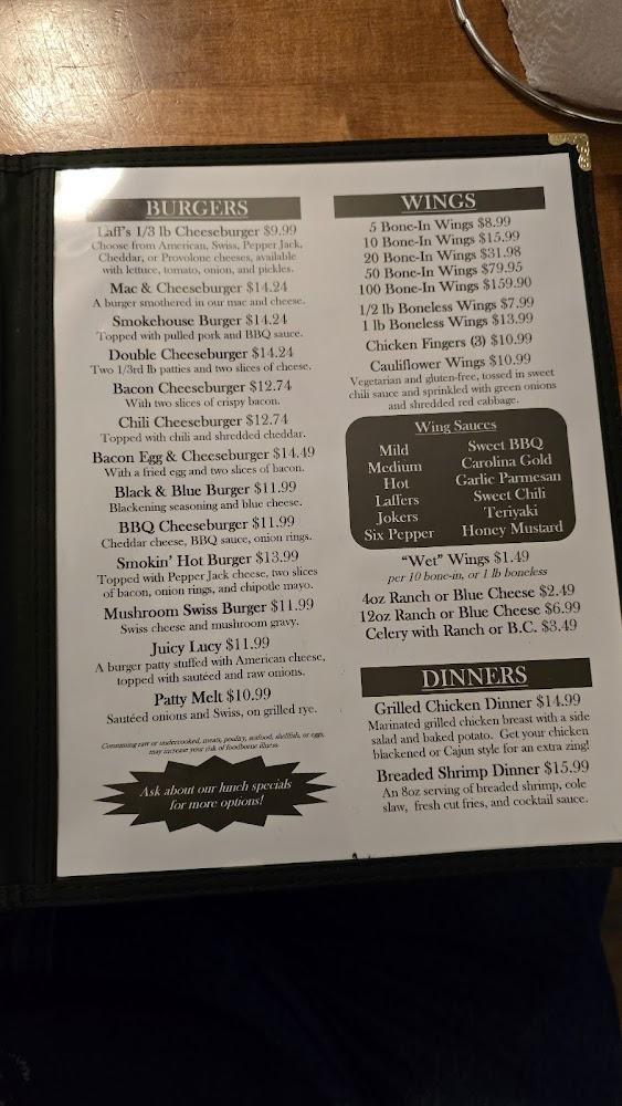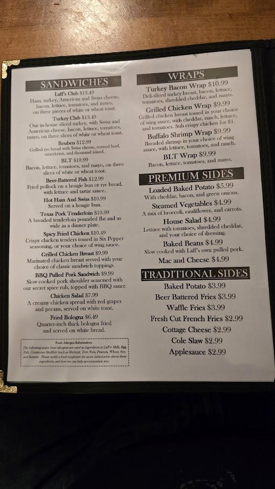 Laff's menu appeals to various tastes. Wings steal the spotlight, showcasing a range of flavors and options. From charming appetizers to fulfilling sandwiches, it's diverse.